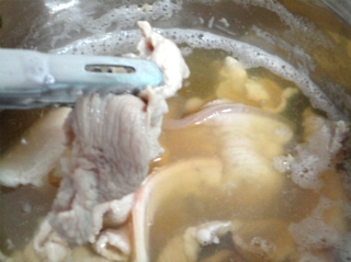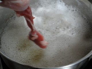 맥주가 끓기 시작하면 돼지고기를 넣고 익혀줍니다.