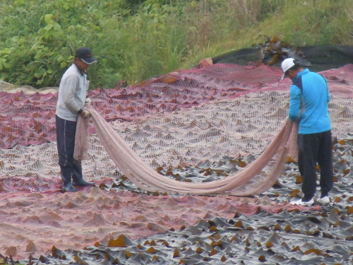 이렇게 널어놓은 다시마위에 2인 1조로 그물을 덮어나갑니다.