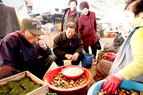 ▲ 녹동장 터줏대감 박동예 할머니 좌판에서 굴맛을 보면서 입에 침이 마르도록 '꿀맛'보다 좋은'굴맛'을 자랑한다.
