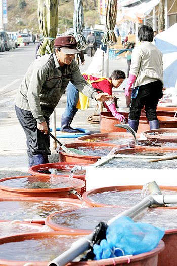 해조류와 굴 더미 사이로 사람들을 유혹하는 것은 바로 새우젓. 김장철 새우젓 나오는 것은