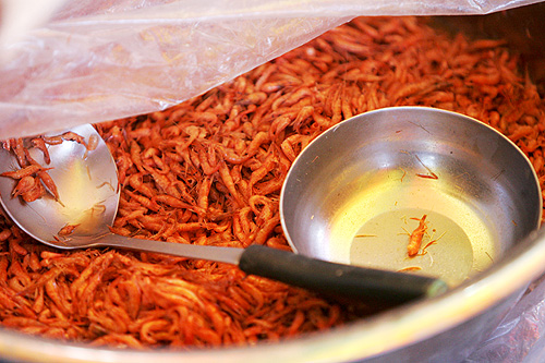 흔한 일이지만 곳곳에 널린 새우젓 가운데 대야에 담긴 새우젓이 사람들의 발길을 붙잡는다.
