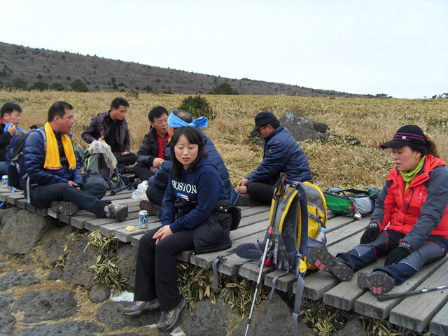거금도 알림이 회원 어리목주차장에서찍은사진 어리목출발 윗세오름 올라가면서 잠시휴식 한라산 텃새가 되어버린 까마기 만세동산및뒤쪽은 한라산정상인 백록담 윗세오름 대피소에 라면실어나르는레일길 윤갑술회장님 라면먹는디 윤종수금산면님,박두영거금도농협조합장님 멋지십니다 제주항 부두